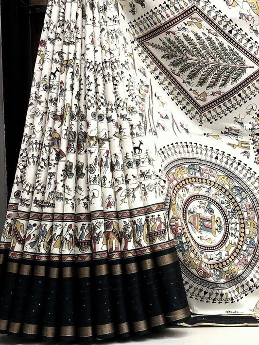 Warli Print Cotton Blend Saree with Stitched Blouse