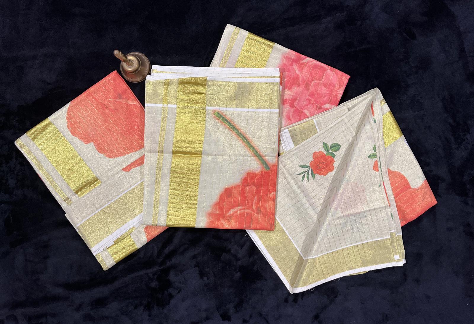 Saree - Gold Kasavu with Digital Flower Prints
