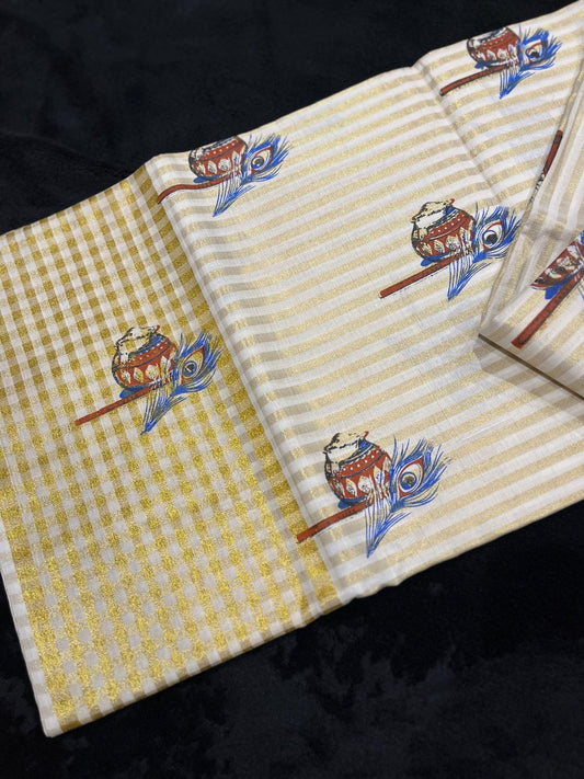 Saree - Gold Kasavu with Pot, Flute & Feather Print