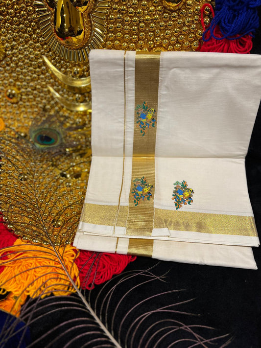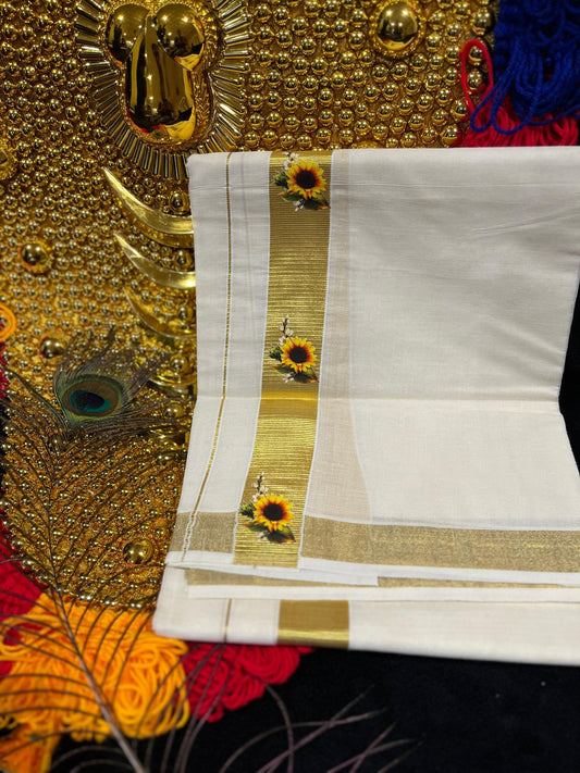 Kasavu Mundu - Gold Border with Thirayattam Print