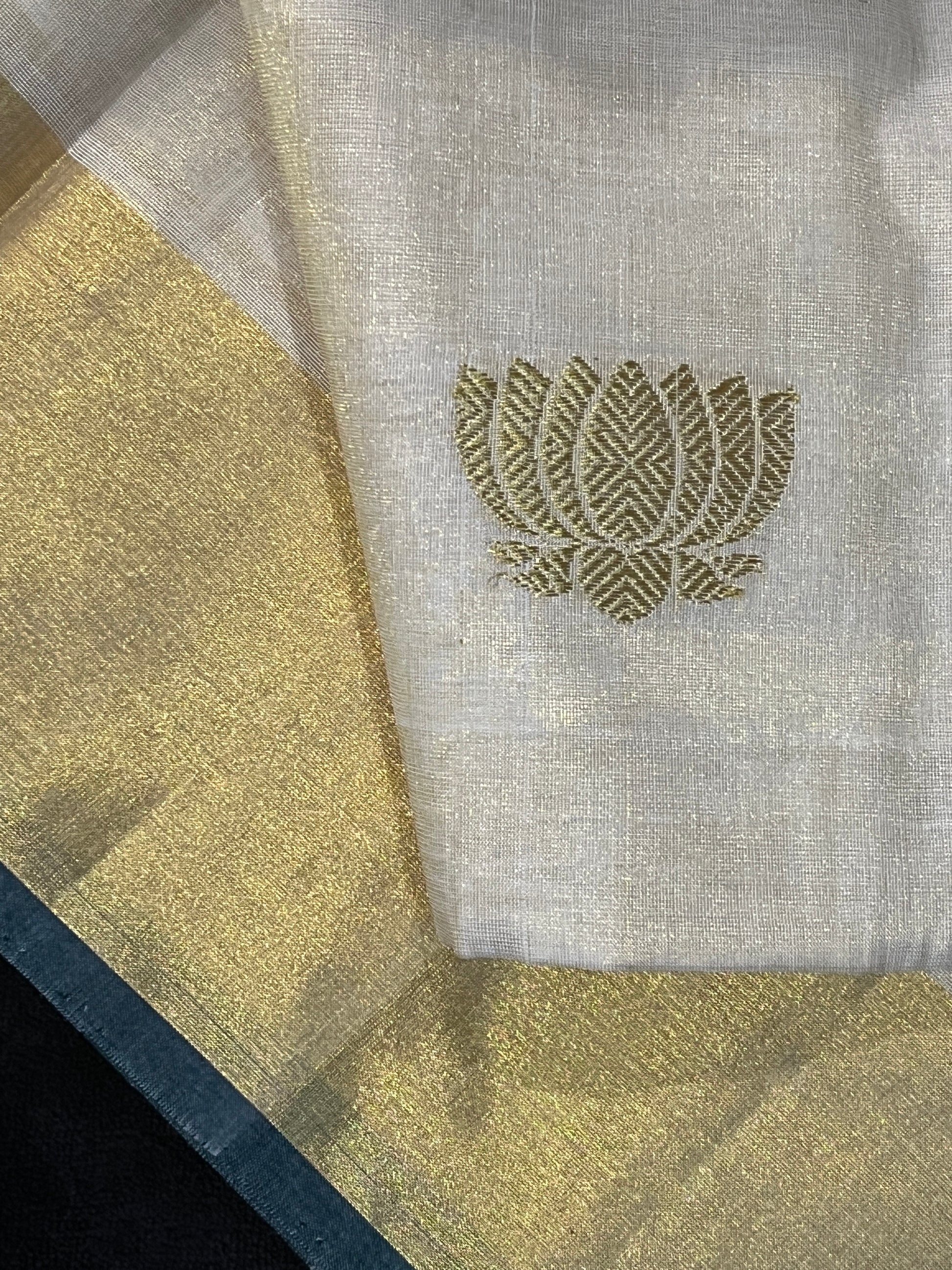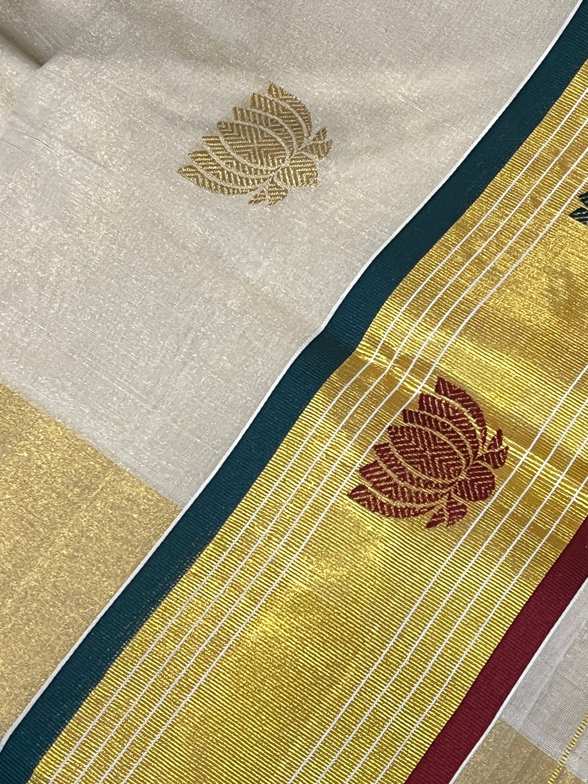 Ganga-Yamuna borders in maroon and green with gold kasavu