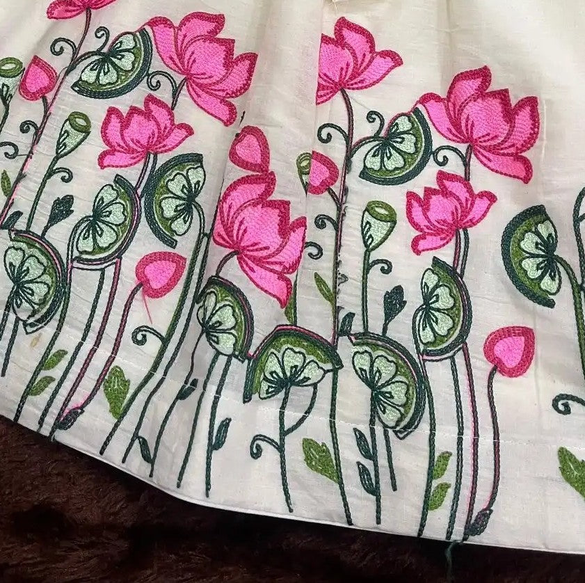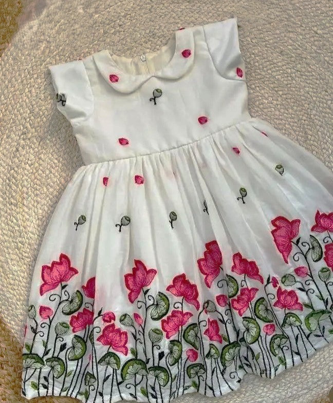 Cute little off-white cotton dress with lotus threadwork for your little girls